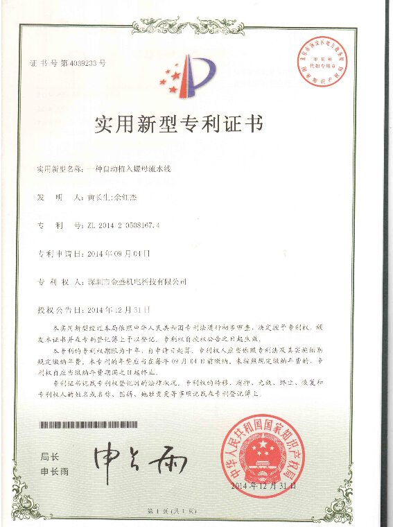 金盛機電再次獲得國家實用型專利證書